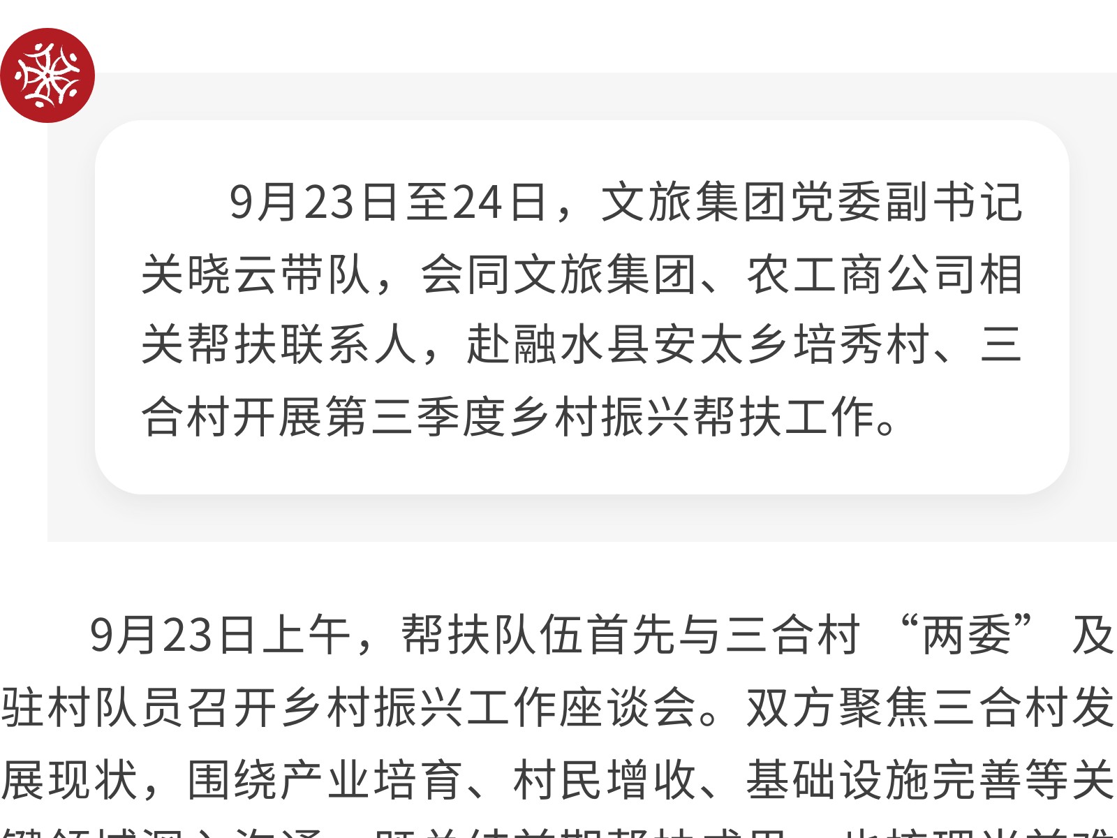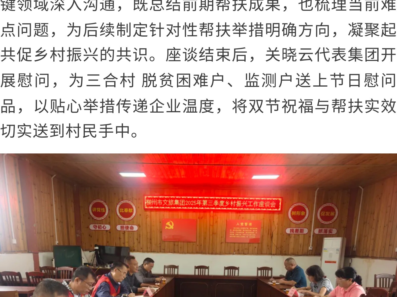文旅集團開展2025年第三季度鄉(xiāng)村振興幫扶活動 發(fā)布時間:2025年09月30日 16時來源:本站原創(chuàng)瀏覽:21 人次
