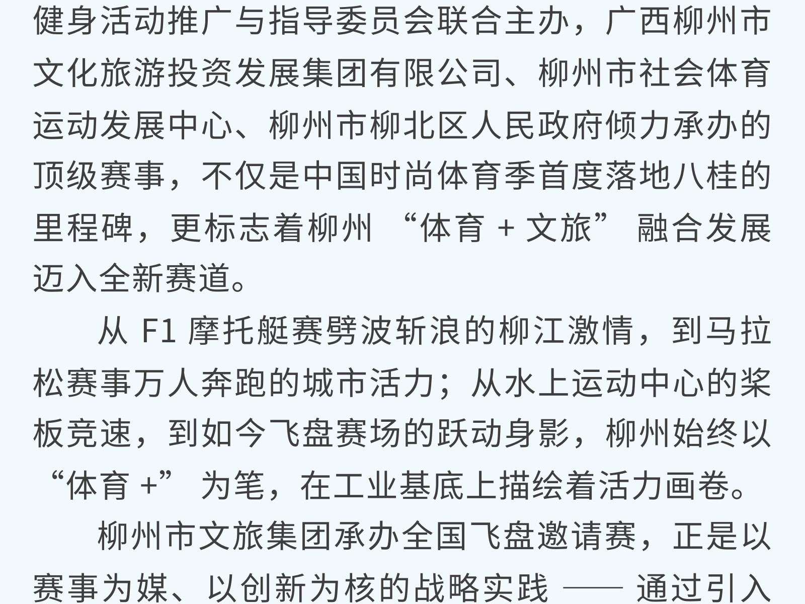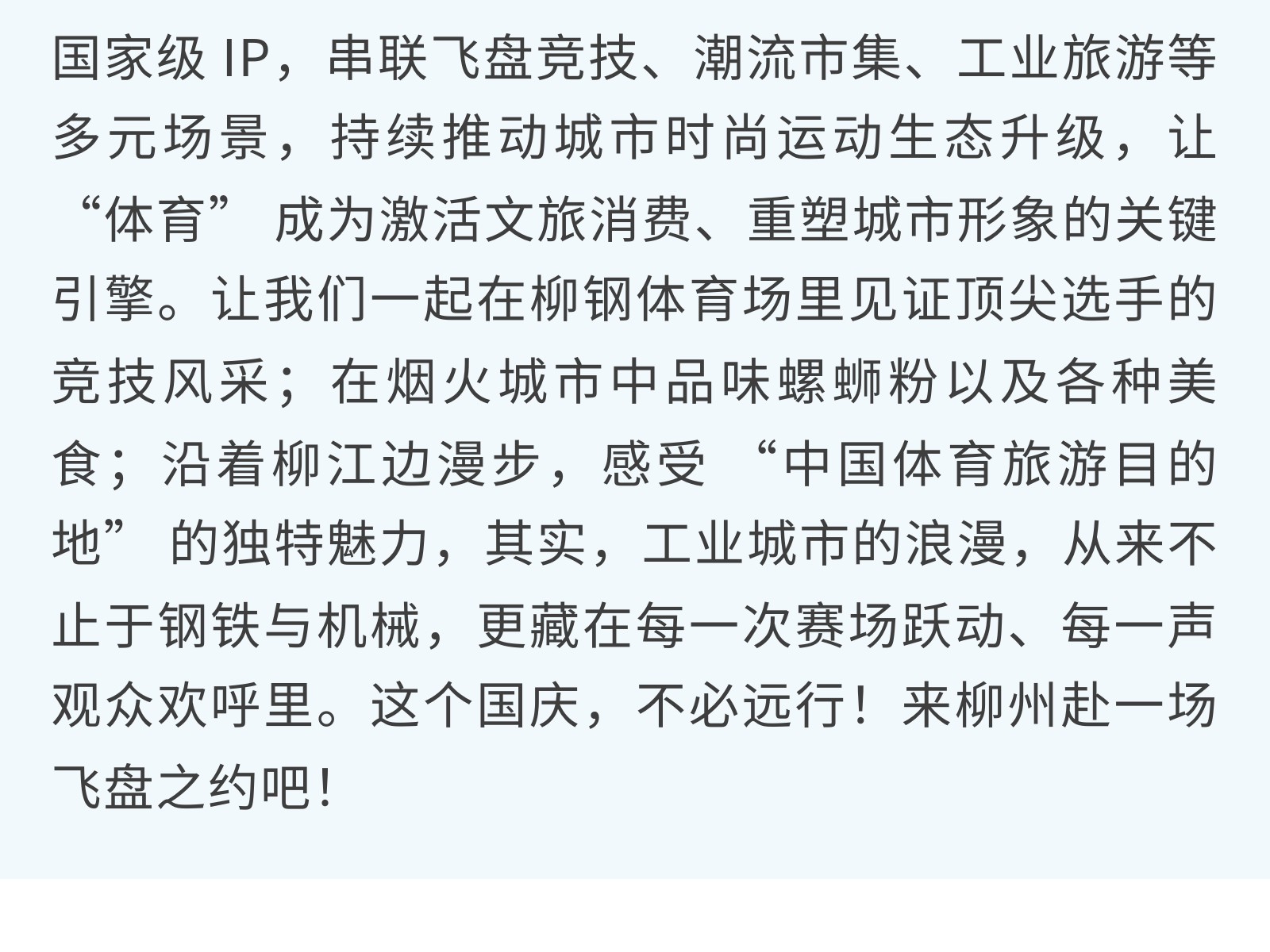 國慶赴柳!鋼鐵賽場飛盤燃,柳州這座體育旅游之城藏不住了 發(fā)布時間:2025年10月02日 17時來源:本站原創(chuàng)瀏覽:25 人次