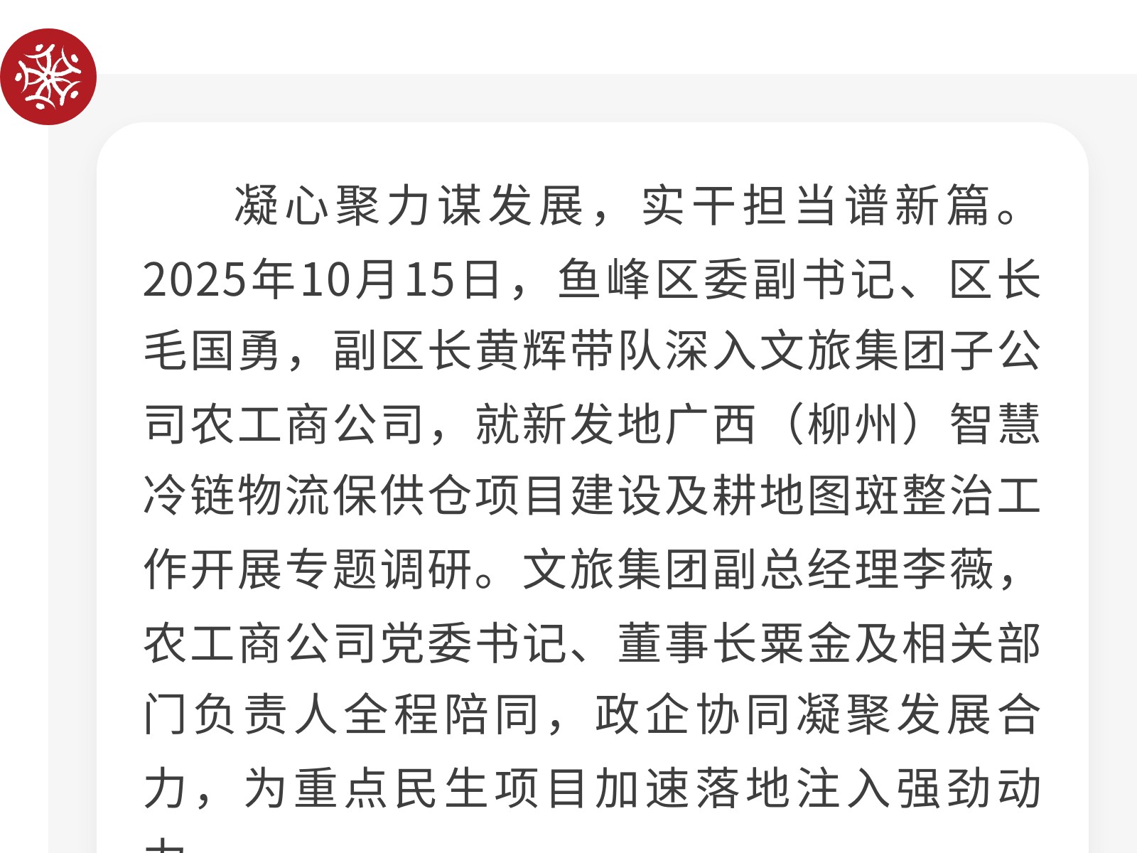 魚峰區(qū)政府主要領(lǐng)導(dǎo)深入調(diào)研指導(dǎo) 文旅集團農(nóng)工商公司全力推進重點民生項目落地 發(fā)布時間:2025年10月16日 09時來源:本站原創(chuàng)瀏覽:88 人次
