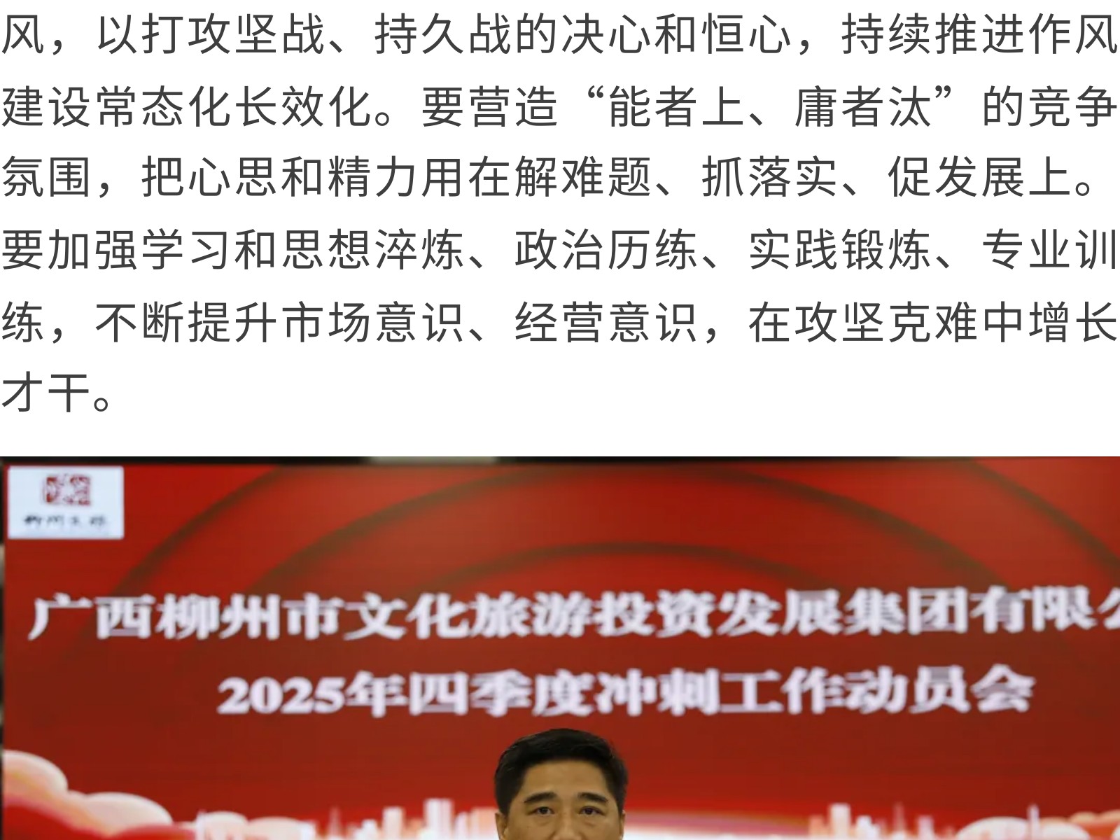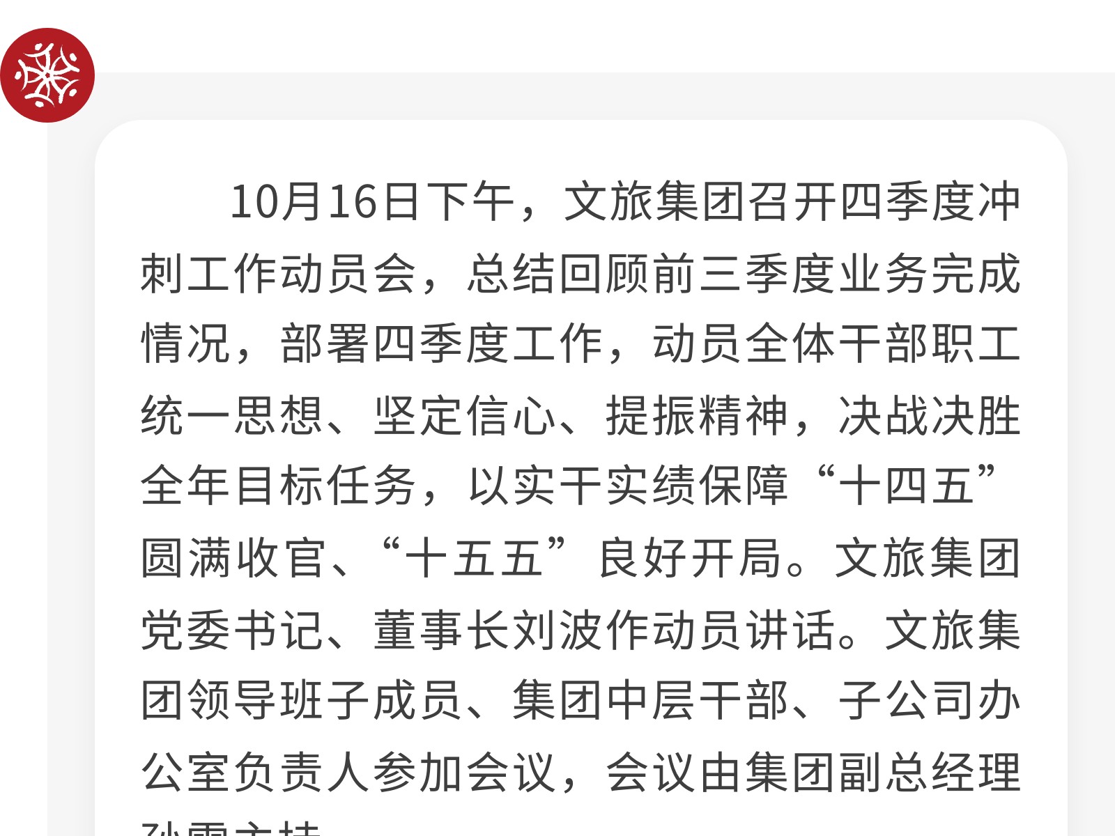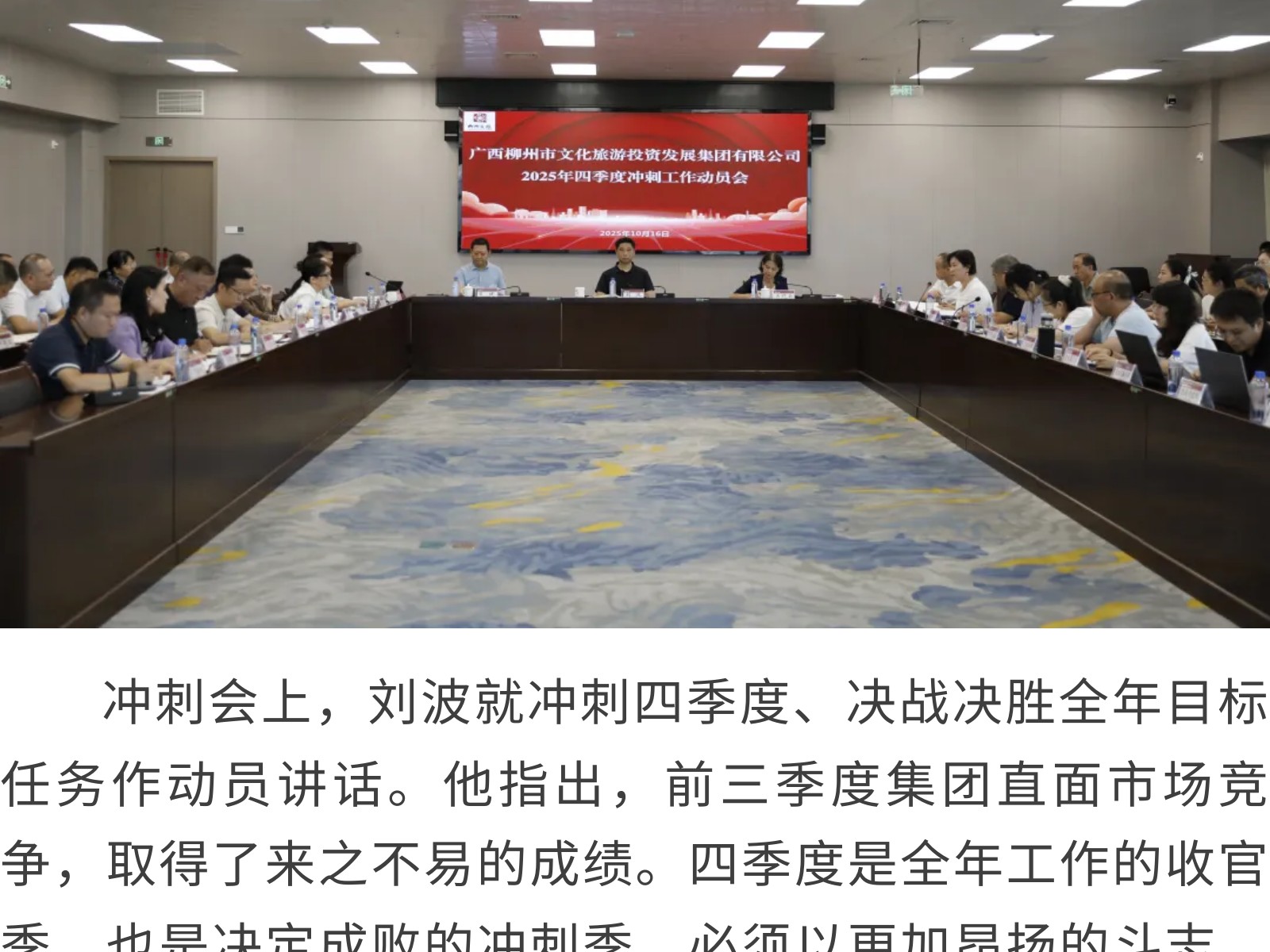 文旅集團(tuán)召開(kāi)四季度沖刺工作動(dòng)員會(huì),決戰(zhàn)決勝全年目標(biāo)任務(wù) 發(fā)布時(shí)間:2025年10月17日 10時(shí)來(lái)源:本站原創(chuàng)瀏覽:32 人次
