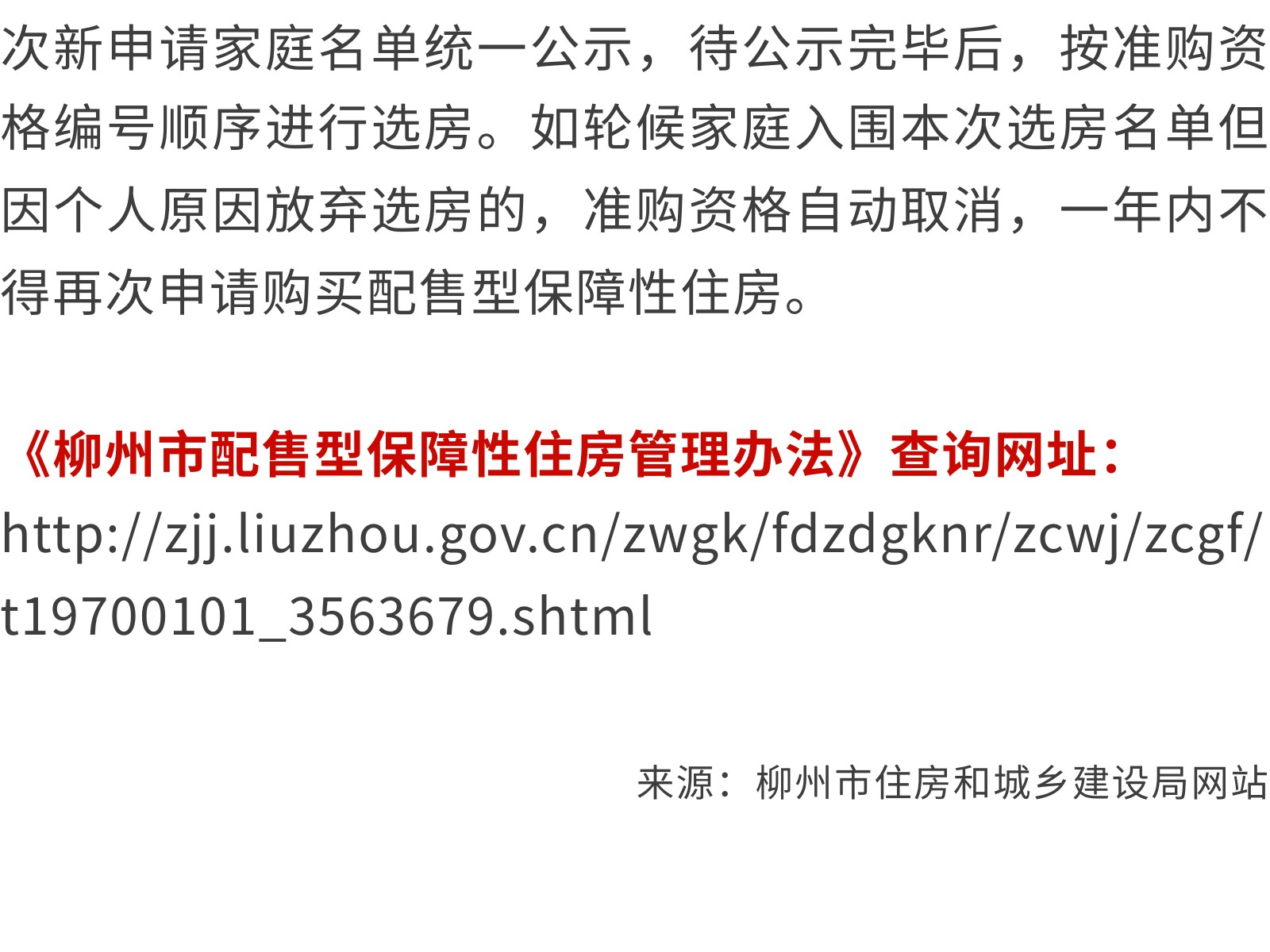 柳州市第二批配售型保障性住房配售公告 發(fā)布時間:2025年11月08日 11時來源:本站原創(chuàng)瀏覽:110 人次
