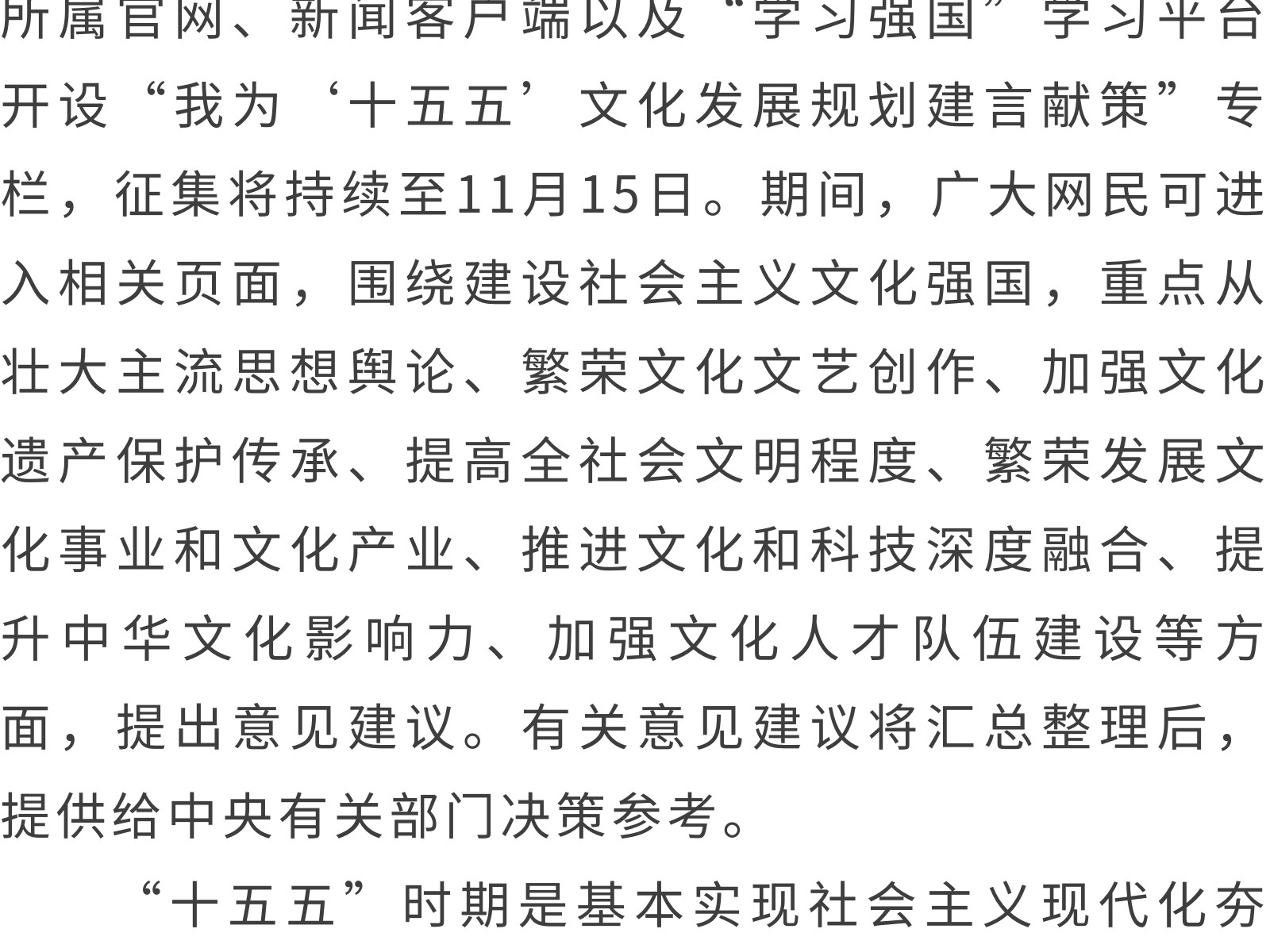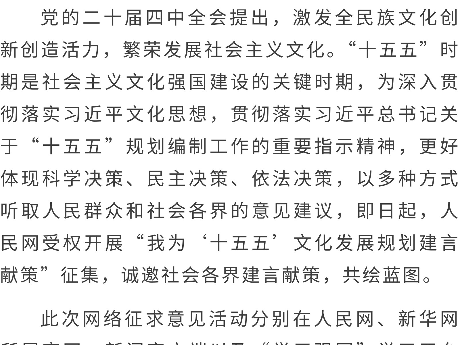 “十五五”文化發(fā)展規(guī)劃編制工作開展網(wǎng)絡(luò)征求意見活動 發(fā)布時間:2025年11月11日 11時來源:本站原創(chuàng)瀏覽:108 人次