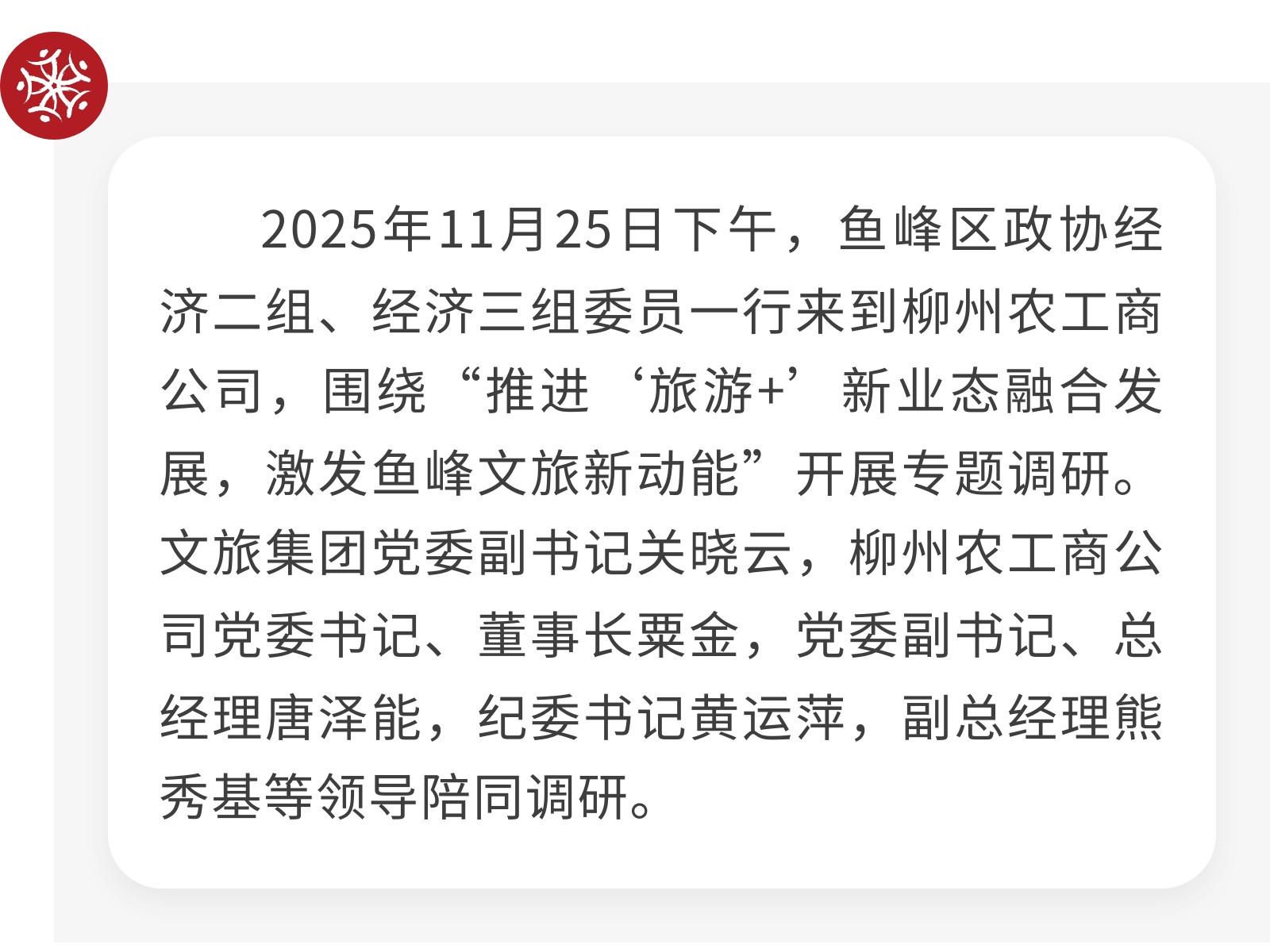 【政協(xié)來“把脈”,文旅添“動能”】魚峰區(qū)政協(xié)專題調(diào)研農(nóng)工商公司 發(fā)布時間:2025年11月28日 09時來源:本站原創(chuàng)瀏覽:25 人次