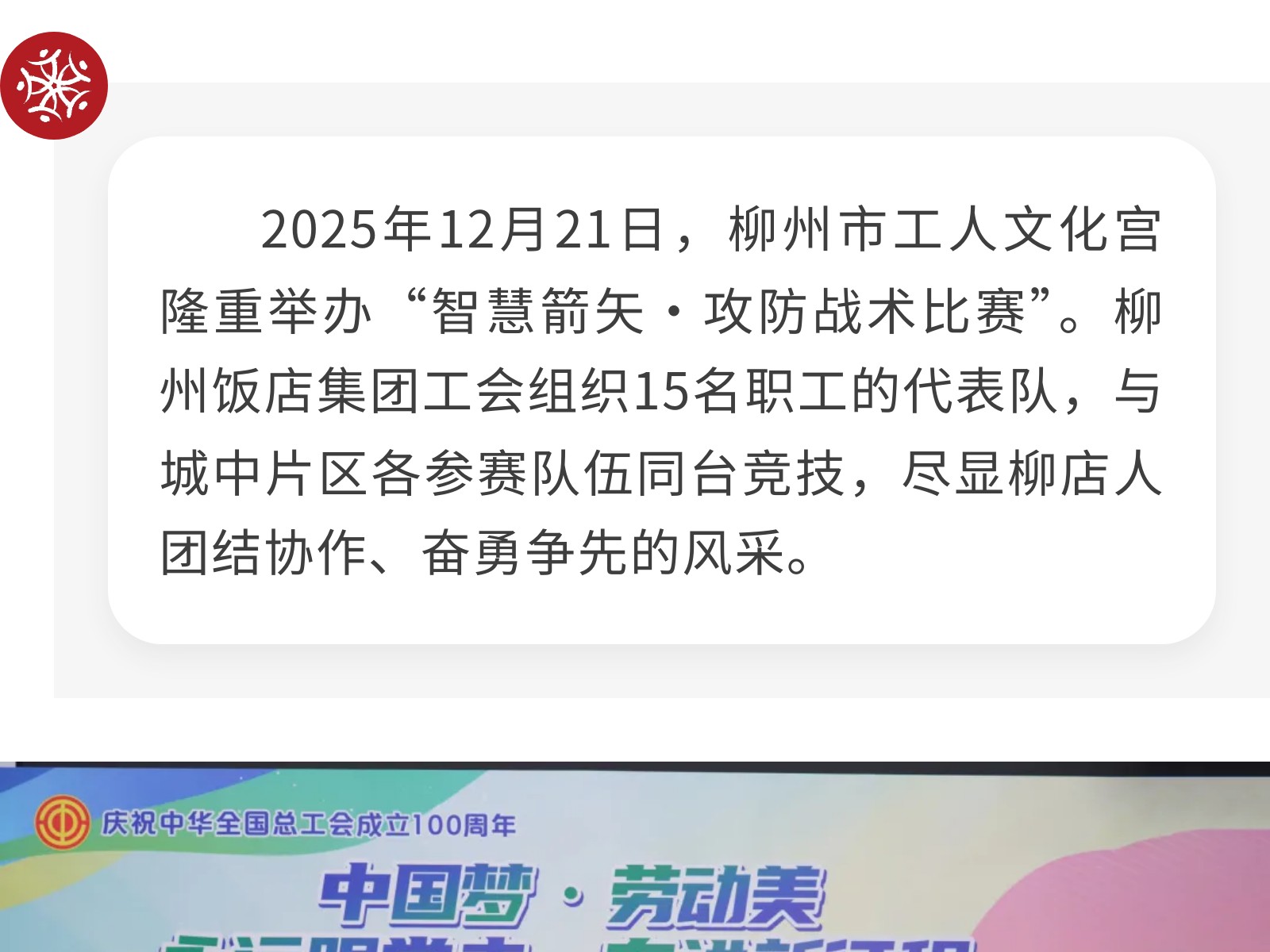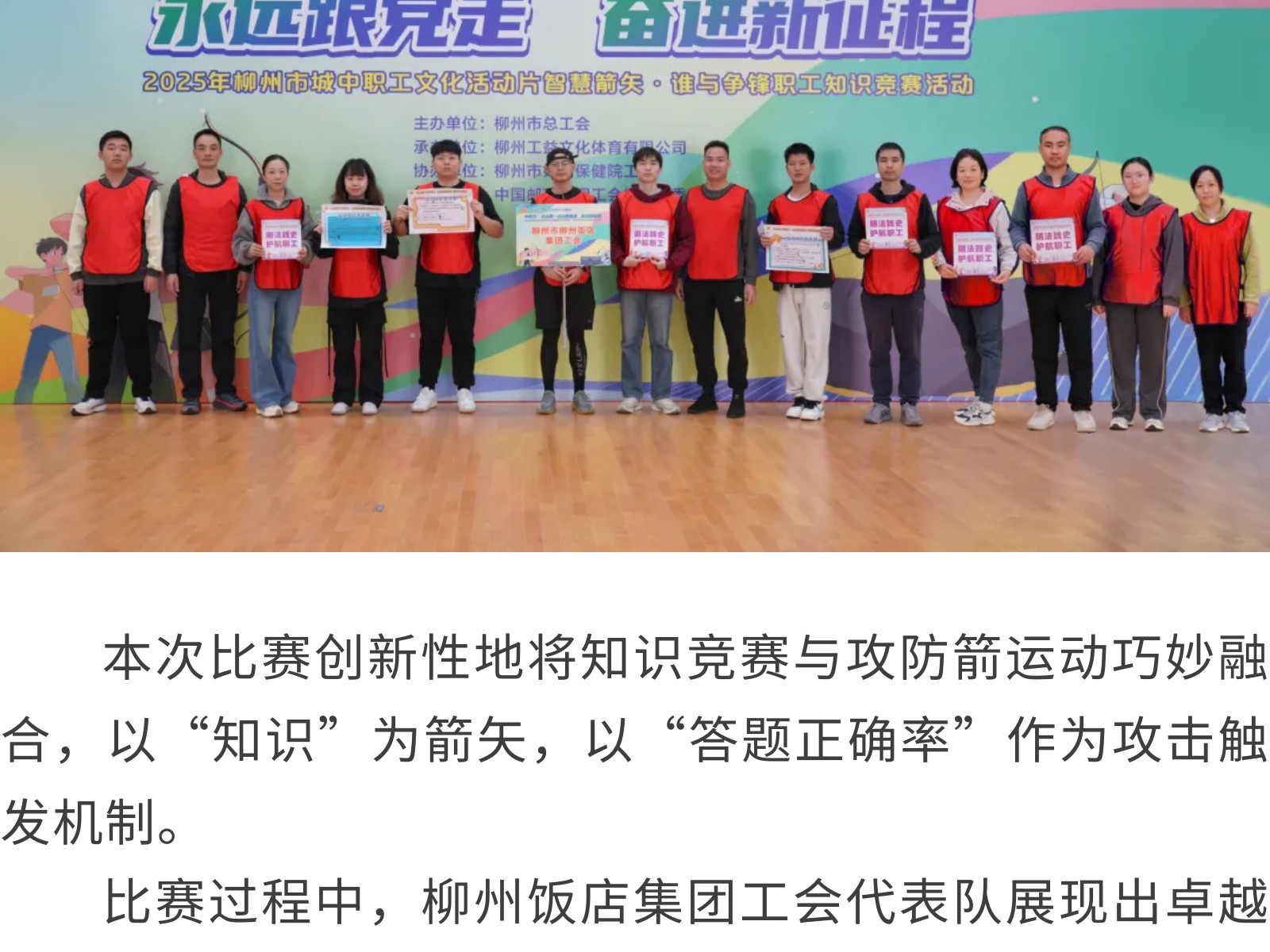 智慧箭矢,誰(shuí)與爭(zhēng)鋒!——柳州飯店集團(tuán)工會(huì)戰(zhàn)隊(duì)閃耀城中職工文化活動(dòng)賽場(chǎng) 發(fā)布時(shí)間:2025年12月30日 11時(shí)來(lái)源:本站原創(chuàng)瀏覽:101 人次