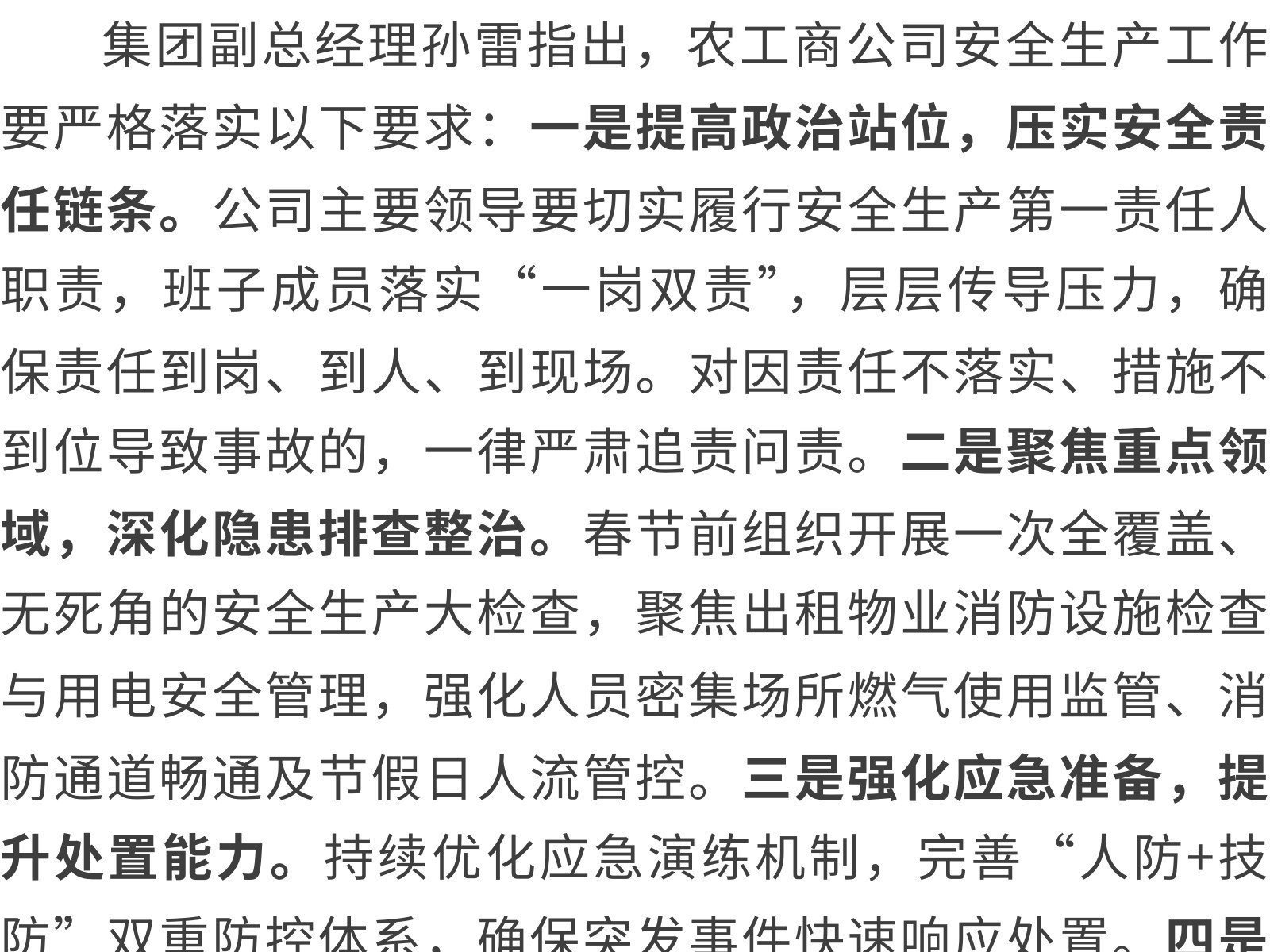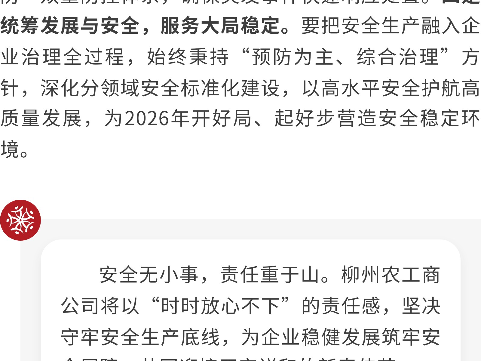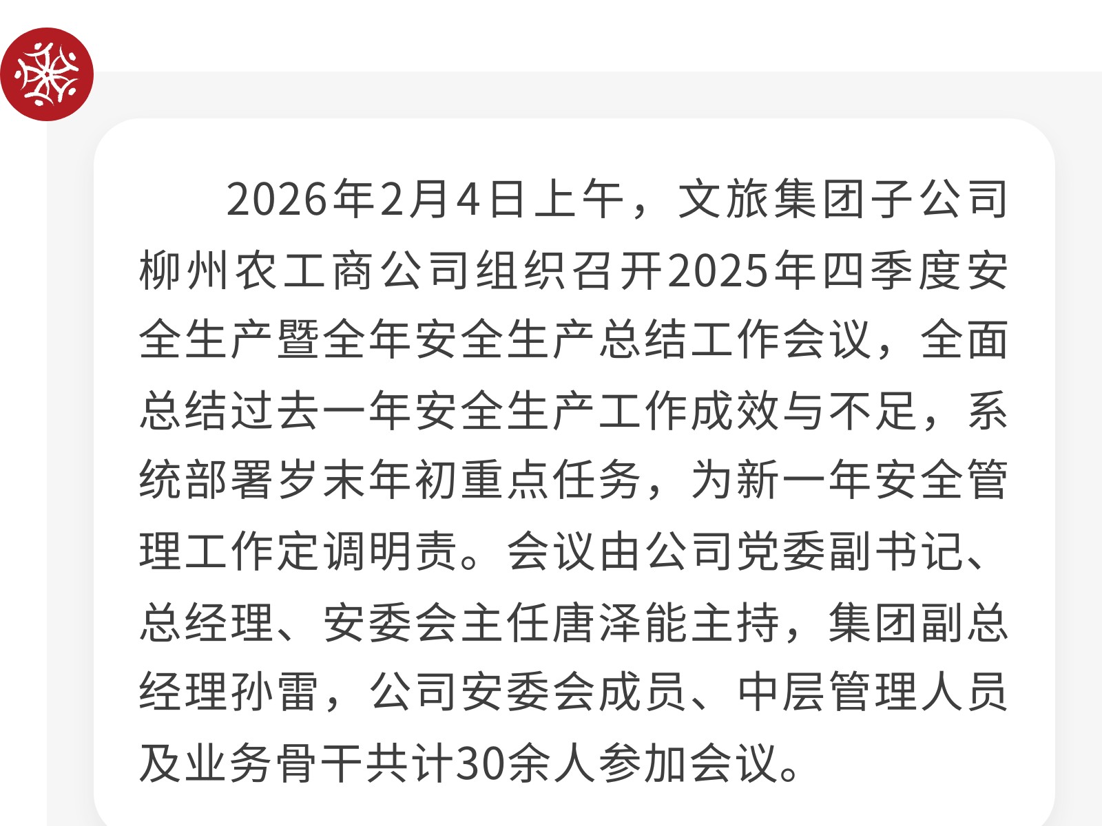 壓緊責任鏈條,筑牢歲末年初安全防線——柳州農工商公司召開2025年度安全生產總結會 發(fā)布時間:2026年02月06日 12時來源:本站原創(chuàng)瀏覽:47 人次