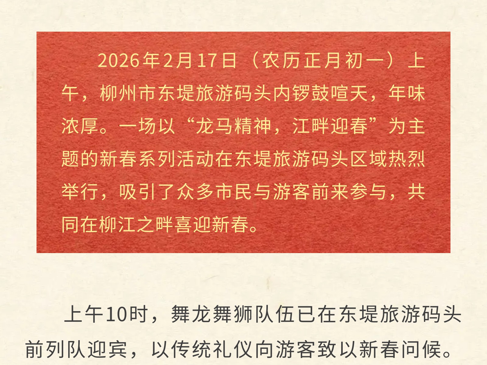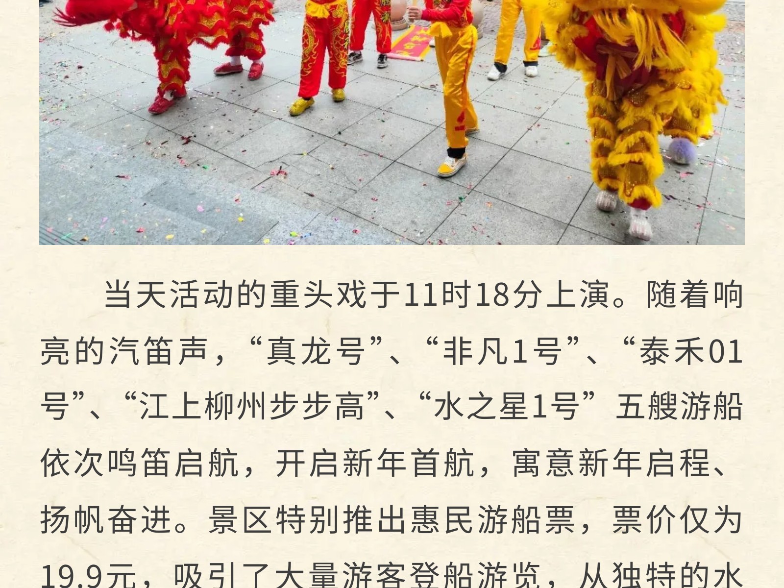 百里柳江景區(qū)“龍馬精神”迎新春,正月初一五船齊發(fā)迎客來(lái) 發(fā)布時(shí)間:2026年02月17日 13時(shí)來(lái)源:本站原創(chuàng)瀏覽:39 人次