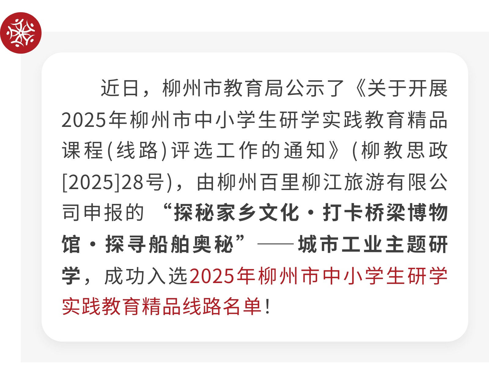 【喜報】百里柳江研學(xué)線路榮膺2025年柳州市中小學(xué)生研學(xué)實踐教育精品線路! 發(fā)布時間:2026年04月07日 19時來源:本站原創(chuàng)瀏覽:16 人次