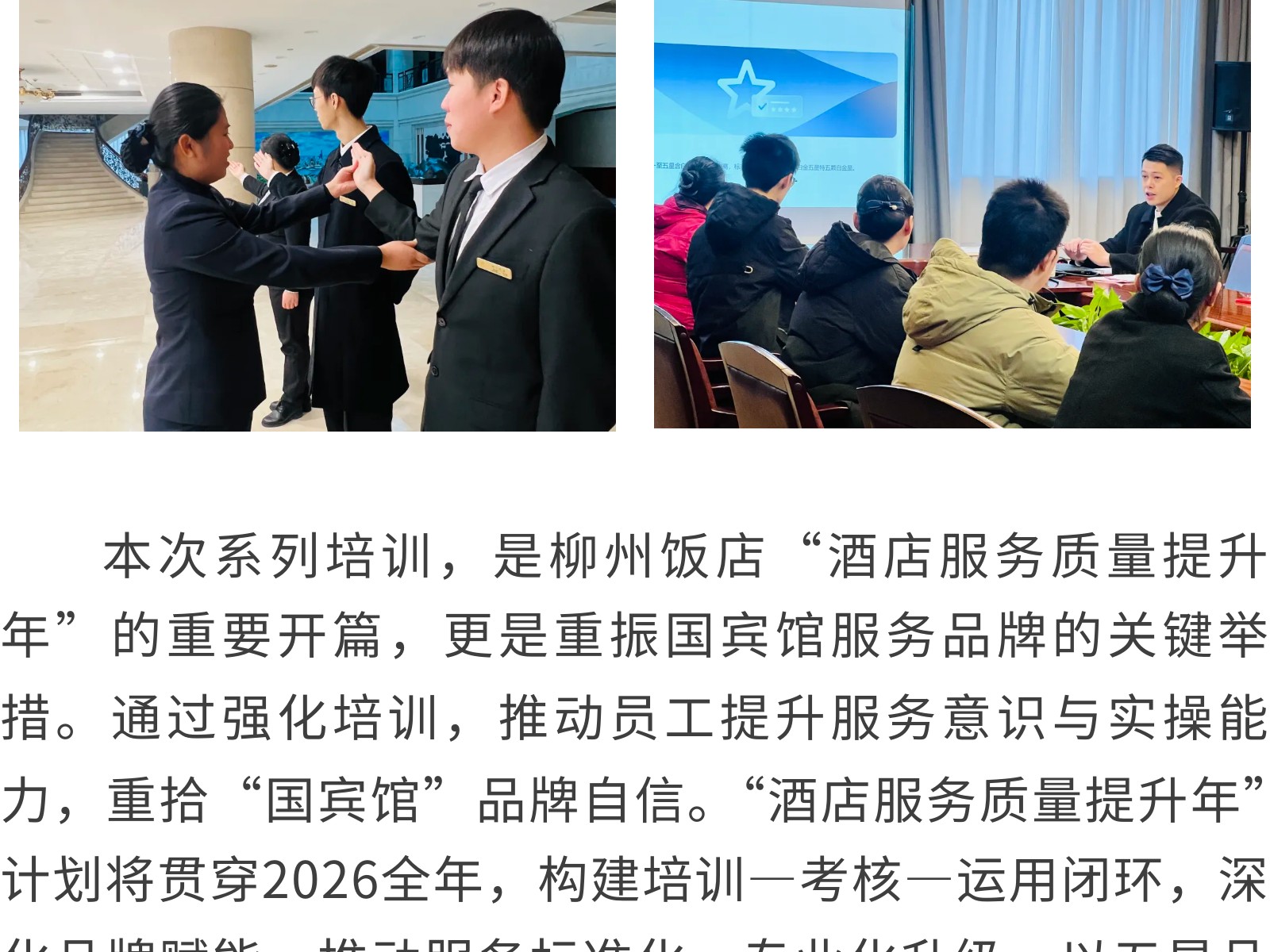 “柳飯學(xué)院”重磅啟班——首期酒店服務(wù)提升班開(kāi)課 以學(xué)促干鑄服務(wù)標(biāo)桿 發(fā)布時(shí)間:2026年02月13日 13時(shí)來(lái)源:本站原創(chuàng)瀏覽:82 人次