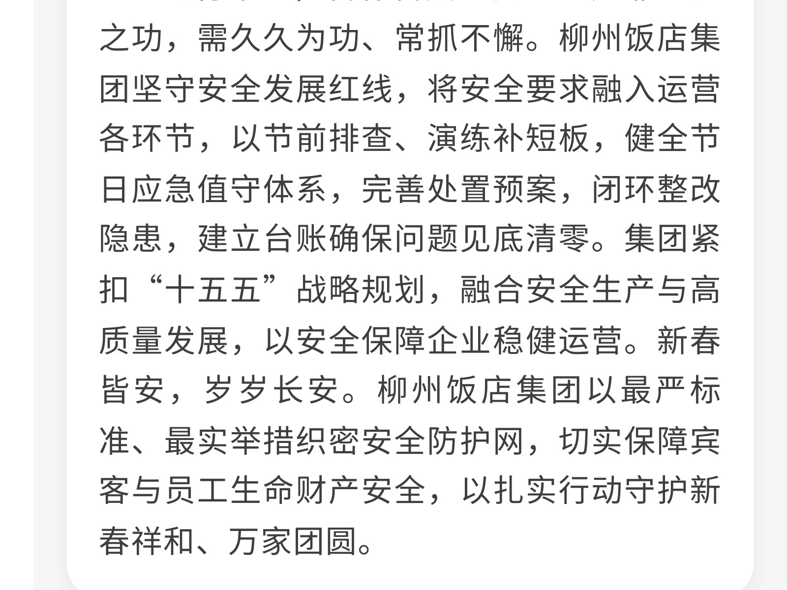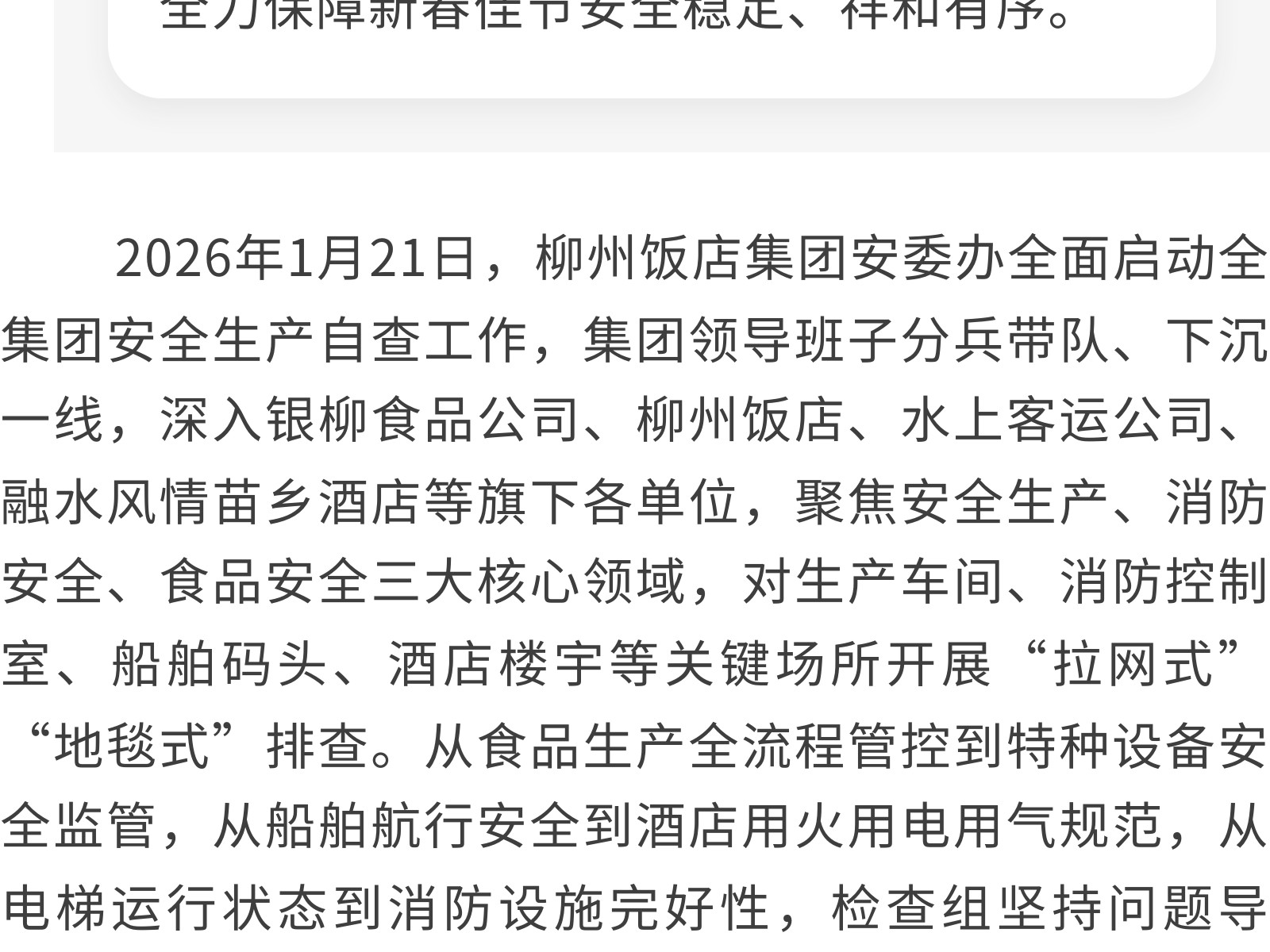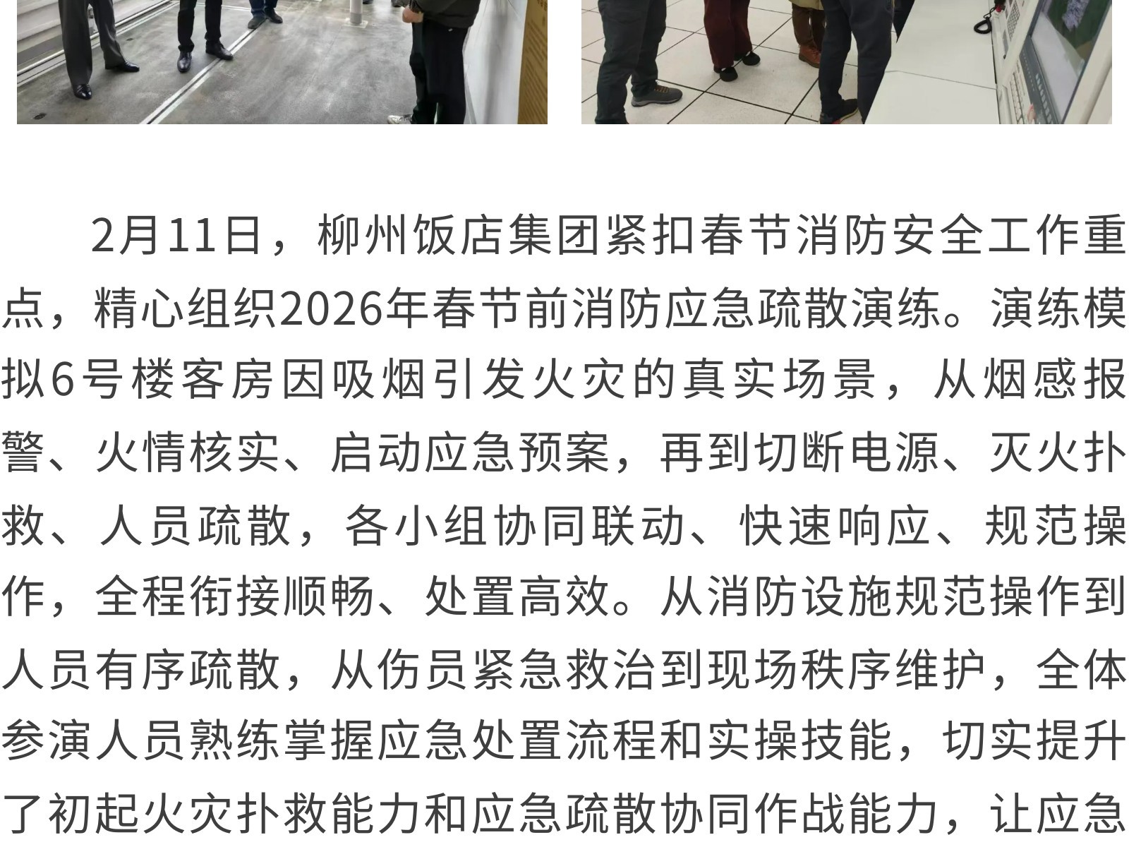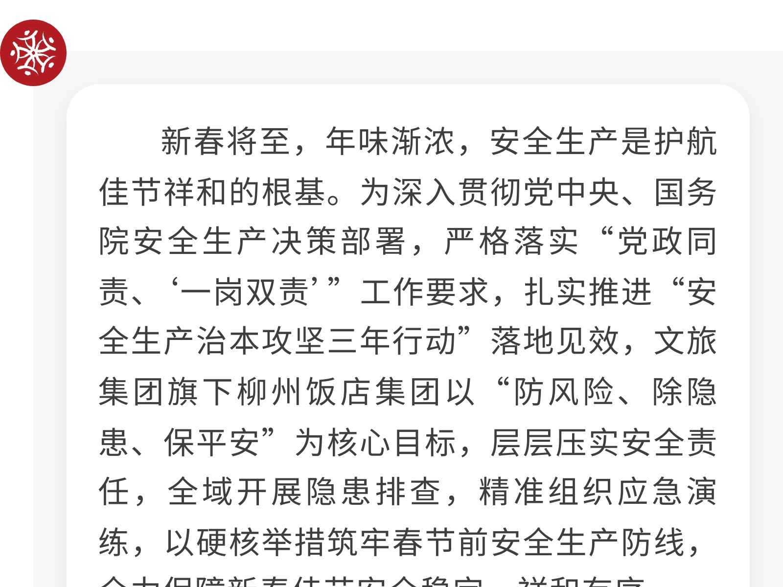 織密安全防護(hù)網(wǎng) 護(hù)航新春平安年——柳州飯店集團(tuán)開展春節(jié)前安全生產(chǎn)系列活動(dòng) 發(fā)布時(shí)間:2026年02月13日 13時(shí)來(lái)源:本站原創(chuàng)瀏覽:80 人次